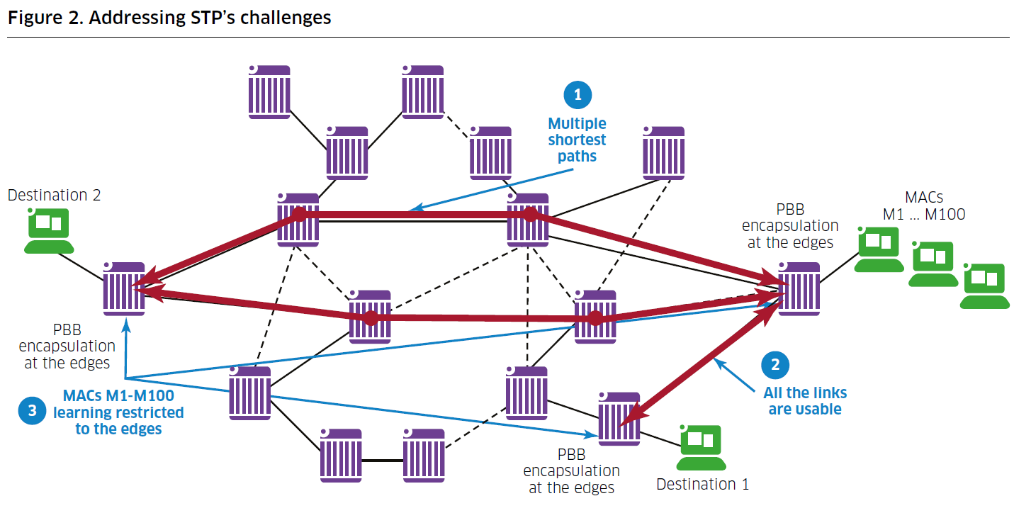 SPB 的技術主要是為了解決傳統乙太網路的生成樹協定 STP 的原理限制。在 STP 中,為了防止廣播風暴,會透過算法避免網路迴圈,將一些串聯成環的網路路徑封住,導致實體線路連接沒有被充分利用、次優傳輸路徑以及收斂時間較慢的問題。在一般小型企業的情境來說,不是什麼太大的問題,也不太會有人感覺到差異。但一旦規模擴大,STP 會限制網路的可擴展性和整體效率。