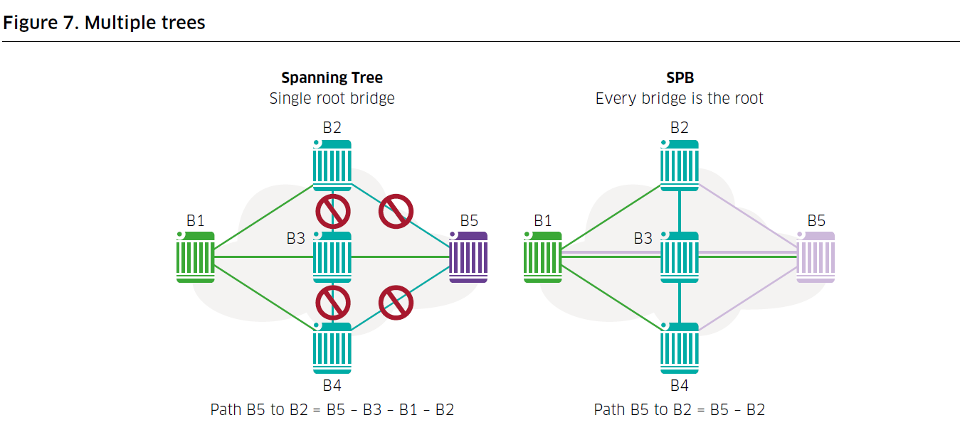 多個拓撲與最短路徑:與 STP 建立單一根橋接樹不同,在 SPB 網路中,每個節點都會建立一個以自身為根的拓撲樹。這確保了任何兩個節點之間的流量始終沿最短路徑傳輸,並且網路中沒有任何鏈路被禁用,所有路徑都是可用的。